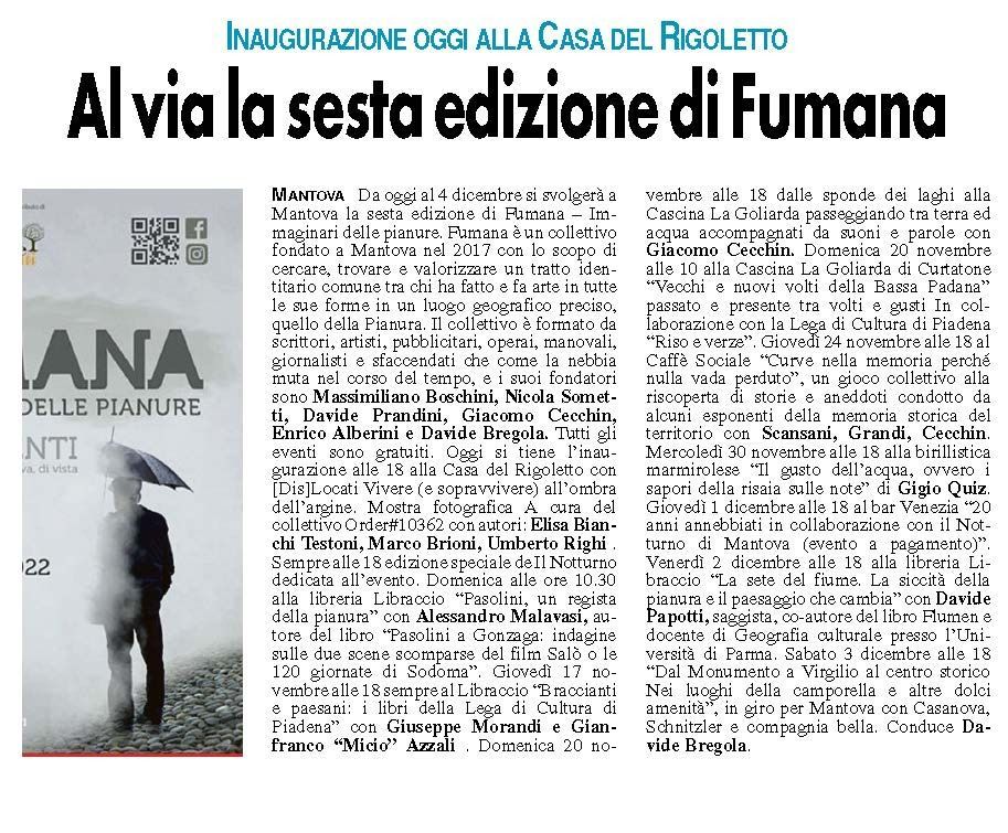 FUMANA è un collettivo aperto e informale, nato a Mantova nel 2017. Riunisce scrittori, artisti, pubblicitari, operai, manovali, giornalisti e sfaccendati: una comunità che, come la nebbia, cambia forma nel tempo. Ne sono fondatori Massimiliano Boschini, Nicola Sometti, Davide Prandini, Giacomo Cecchin, Enrico Alberini e Davide Bregola. Nel 2025 si è aggiunto Paolo Patria.